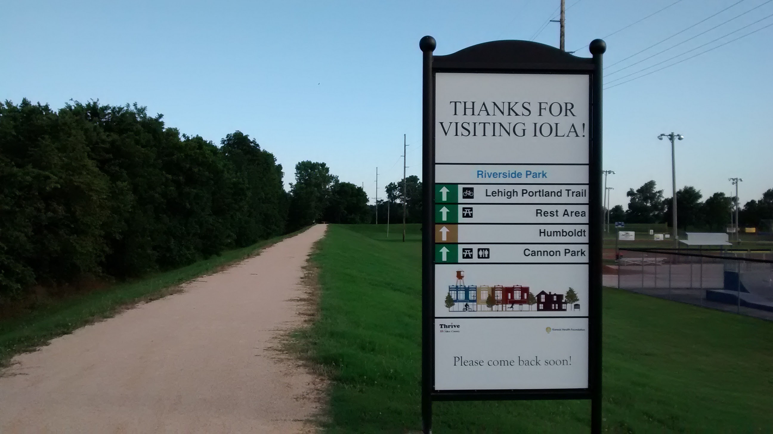 Coming from the south, here is the first thing that visitors see as they arrive at Riverside Park in Iola, welcoming riders and pointing to downtown, the Mo-Pac Trail, Cofachique Park, and the Prairie Spirit Trail: